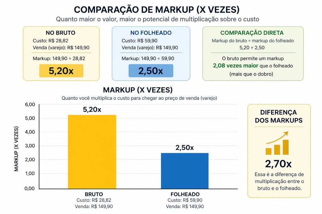 O Markup da peça no bruto será de 5,2 vezes e a do folheado 2,5 vezes.
